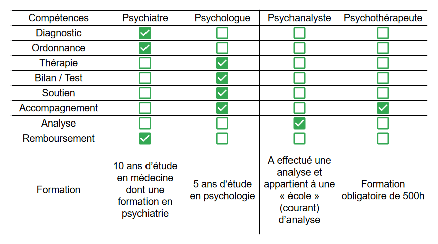 Voici un tableau récapitulatif des compétences des professionnels dits « psys » :